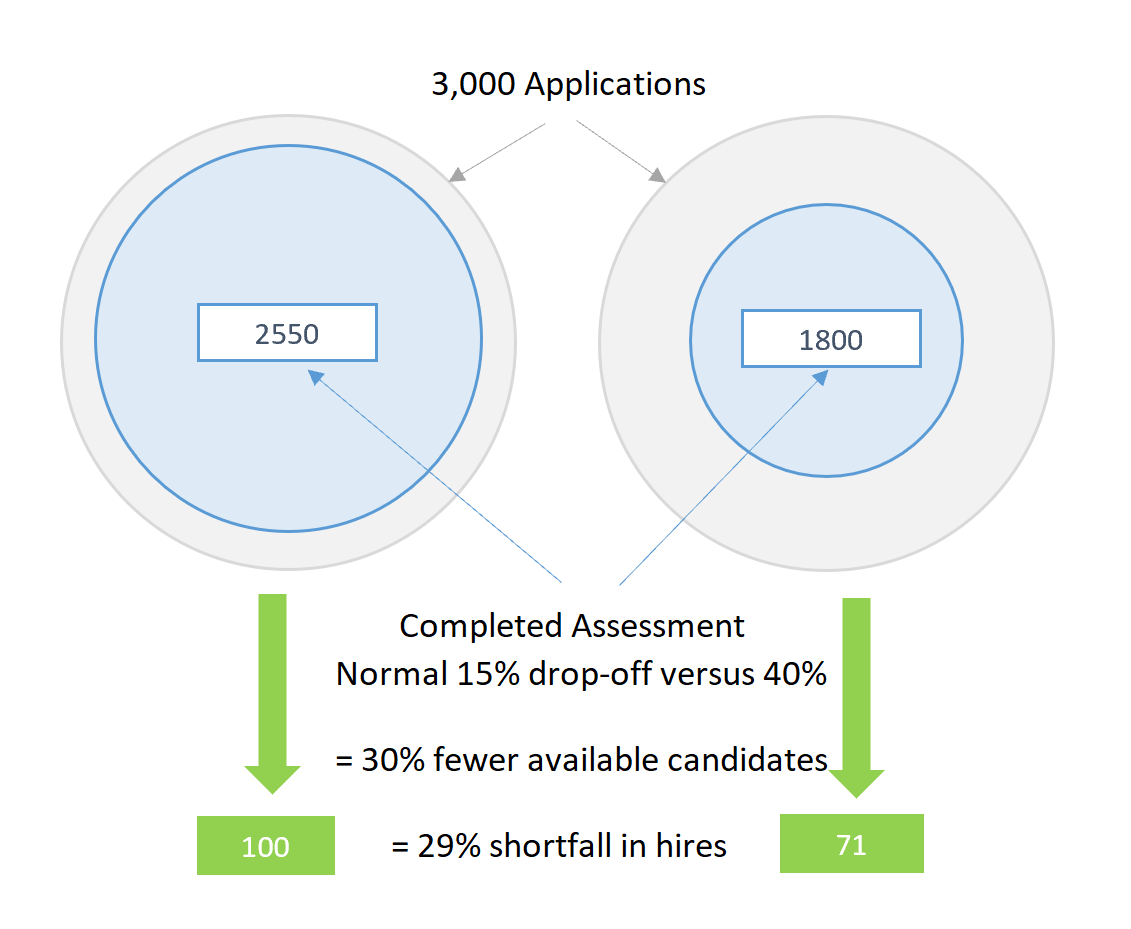 Gen Z Application Drop-OffsResearch by Bullhorn of a 1,000 US Gen Z workers shows the majority (85%) concur that the entire job search and placement process is outdated, resulting in two out of five abandoning an opportunity between application and interview, and one in three giving up before even submitting an application. What are the symptoms employers experience: When more than 20% of applicants are dropping out at any assessment stage, it’s a red alert signal for a recruiter. Here’s a visual example of what happens to an employer receiving 3,000 applications but finding the applicant drop-off from the initial psychometric assessment jumps from a normal 15% to 40%.